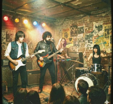 The Acid Vipers blast into the mist of a packed, humid cellar venue from 1966, merging garage rawness with psychedelic distortion and a dim amber glow.